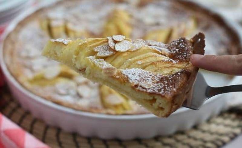 Umplutura: Folosind un mixer electric, bateti ouale, zaharul si zaharul vanilat. Adaugati migdalele macinate (pudra de migdale) si smantana lichida si bateti din nou. Descojiti merele si taiati-le in jumatate, indepartand miezul. Taiati felii subtiri de aceeasi grosime. Asezati cate o jumatate de mar taiata felii peste aluat si rasfirati-le putin (vezi fotografii + video). Adaugati celelalte jumatati de mere si formati o floare. Turnati compozitia de la pasul 6 peste mere si dați la cuptorul preincalzit la 190° C timp de 30 de minute. Se lasa sa se raceasca si se decoreaza cu fulgi de migdale prajiti si zahar pudra.