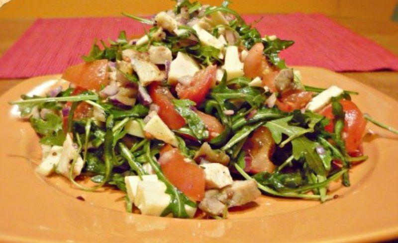 Mod de Preparare: Pieptul de pui se condimentează cu sare și piper. Se pune pe grătarul/grilul încins câte 3 minute pe fiecare parte. Se scoate și se taie fâșii. Pe un platou se așează rucola, se stropește cu ulei de măsline și zeama de la 1/2 lămâie. Peste rucola aranjăm fâșiile de carne. Într-un castronel amestecăm iaurtul cu usturoiul tocat mărunt, mărarul și partea albă de la ceapa verde tocată mărunt. Turnăm sosul peste carne și presărăm restul de ceapă verde toactă mărunt.