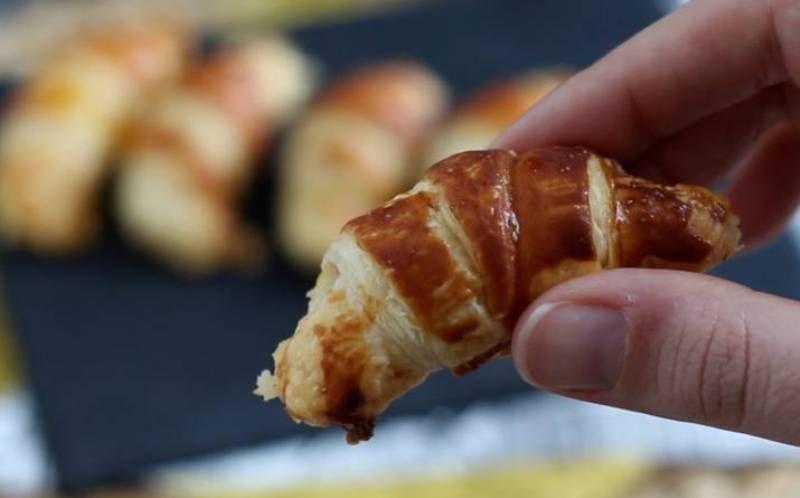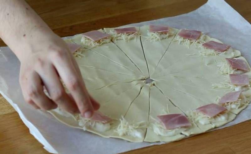 Mod de Preparare: Desfaceți aluatul de foietaj. Tăiați șunca presată în bucăți. Tăiați aluatul în 16 triunghiuri. Așezați aproximativ o linguriță de bechamel pe fiecare bază a fiecărui triunghi. Deasupra se presară cașcaval ras apoi se așează o bucată de șuncă peste cașcaval. Preîncălziți cuptorul la 180°C. Rulați triunghiurile începând de la bază și terminând la vârf. Îndoiți capetele spre interior, ciupindu-le pentru a forma semilune. Aranjați cornurile astfel formate, pe o tavă de copt acoperită cu hârtie de copt. Ungeți fiecare cornule cu gălbenuș. Coaceți cornurile la cuptor pentru 20 de minute la 180°C. Gata, aperitivul este gata!