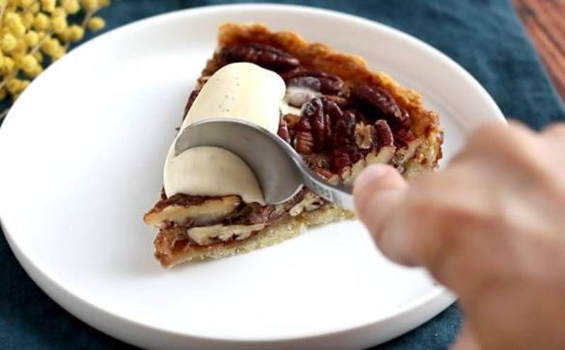 Pentru uns: Bateti oul si laptele si periati marginile aluatului, astfel incat sa se rumeneasca dupa a doua coacere. Aranjati nucile pecan pe toata suprafata aluatului si turnati umplutura deasupra. Coaceti timp 35 de minute la 180° C. Lasati sa se raceasca si asezati o lingura de inghetata (sau frisca) pe bucata de placinta, la momentul servirii.
