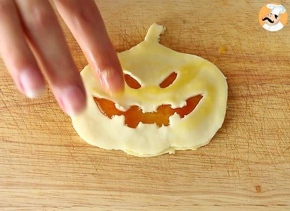 Mod de Preparare: Desenati sau imprimati un dovleac de Halloween si decupati-l pentru a face un sablon. Desfaceti aluatul de foietaj. Puneti sablonul pe el si decupati numai conturul. Bateti oul ca pentru omleta. Cu degetul curat, aplicati ou batut pe conturul dovleacului. Puneti o lingurita de gem de caise si intindeti-o in centrul dovleacului. Decupati din nou un dovleac din aluatul de foietaj taind ochii si gura de data aceasta. Asezati acest salon peste dovleacul din foietaj uns cu gem de caise. Presati marginile pentru a le face sa se lipeasca. Aplicati ou batut si deasupra pentru a obtine o crusta maronie, apoi pudrati usor cu zahar pudra. Repetati procesul pentru a face 5 dovlecei pufosi de Halloween. Puneti in cuptor timp de 20 de minute la 180° C.