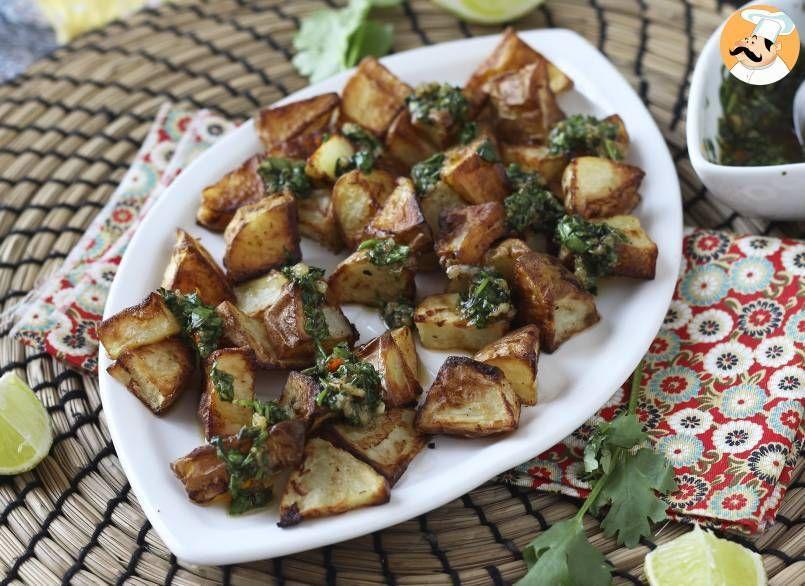 Se condimentează cu sare, piper și paprika. Se amestecă din nou. Se lasă sosul chimichurri să stea timp de aproximativ 30 de minute pentru a permite tuturor aromelor să se integreze. De asemenea, puteți prepara sosul cu o zi înainte și să îl păstrați în frigider. Aromele vor fi și mai bine integrate. Odată ce cartofii sunt gata, scoateți-i din cuptor și lăsați-i să se odihnească timp de câteva minute. Acum servește cartofii cu chimichurri. Puteți turna chimichurri peste cartofi sau îl puteți servi alături, astfel încât fiecare să poată ajusta cantitatea după gustul său. Poftă bună!