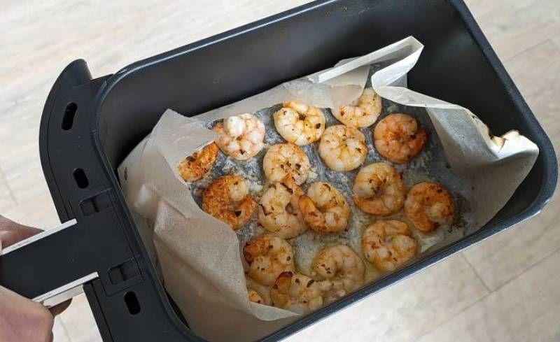 Mod de Preparare: Curățați creveții, strângeți cozile și puneți-le într-un castron. (Dacă folosiți cozi de creveți congelate, pur și simplu dezghețați-le într-un castron și scurgeți-le.) Tăiați mărunt un cățel de usturoi și puneți-l în vasul cu creveții. Adăugați apoi sucul de lămâie, piperul și un praf de sare. Amestecați bine. Acoperiți vasul cu folie alimentară și lăsați creveții la marinat la frigider pentru cel puțin 15 minute. Tapetați coșul friteuzei cu aer cu hârtie de copt și aranjați creveții. Gătiți 12 minute la 190°C. Creveții sunt gata! Îi puteți asezona cu sucul lor de gătit și puțin pătrunjel proaspăt măruțit, pentru a da mâncării mai multă aromă.