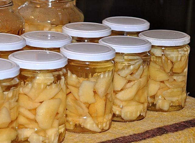Mod de preparare: Speli fructele si le tai cubulete (sau felii, dupa dorinta). Asezam fructele in borcane. Adaugam cate 3 linguri cu zahar si completam cu apa calduta. Inchidem borcanele si sterilizam la bain-marie 30 minute din momentul in care a inceput sa clocoteasca apa. Se lasa borcanele in vasul in care au fiert, pana se raceste apa. Scotem borcanele, etichetam si depozitam la rece, in camara.