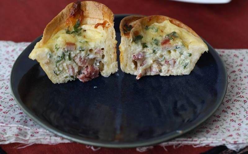 Mod de Preparare: Se prăjește baconul până se topește grăsimea. Se așază tortilla una peste alta și se taie în 6 bucăți. Se bat ouăle împreună cu laptele, sarea, piperul, praful de usturoi și pătrunjelul tocat. Se adaugă baconul și mozzarella rasă. Se rulează bucățile de tortilla și se pun în formele de brioșe unse. Umpleți cavitățile formei cu umplutura. Coaceți în cuptor timp de 13 minute la 180°C (cuptorul trebuie să fie preîncălzit în prealabil). Și acum micile tale quiche-uri de tortilla sunt gata!