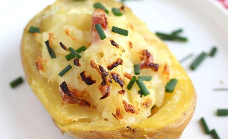 Mod de Preparare: Spalam cartofii fara sa-i curatam de coaja si ii punem la fiert in apa cu sare pt aproximativ 30 minute. Dupa ce s-au fiert ii lasam sa se raceasca putin si ii curatam de coaja. Taiem marunt sunca si ceapa verde. Luam cartofii si taiem un capac de circa 2 cm latime pe lungimea fiecaruia. Apoi scobim cu lingurita din miez, lasand un strat de 1 cm grosime. Amestecam sunca si ceapa verde cu crema mascarpone si potrivim de piper Umplem fiecare cartof cu aceasta compozitie. Punem cartofii intr-o tava termorezistenta, presaram cu bucatele de unt si dam la cuptorul preincins la 180 grade pt 15 min sau pana se rumenesc usor. Pofta buna!