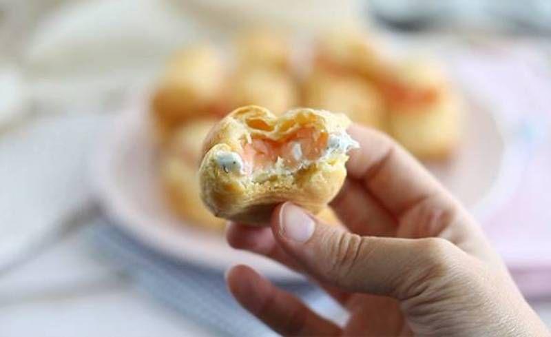 Choux cu somon - Preparare etapa 2Luati de pe foc si adaugati ouale unul cate unul, amestecand de fiecare data. Se amesteca energic, deoarece elasticitatea aluatului se formeaza in aceasta etapa. Folosind un posh, formati cojile la dimensiunea dorita. Bateti oul si ungeti cojile cu o pensula, rotunjind bine forma. Coaceți 25 de minute la 180°C . Aveti grija, ca la sfarsitul gatitului, sa nu le scoateți direct de din cuptor, pentru ca se vor dezumfla. Lasati usa cuptorului deschisa sa se raceasca timp de 10 minute inainte de a le scoate.