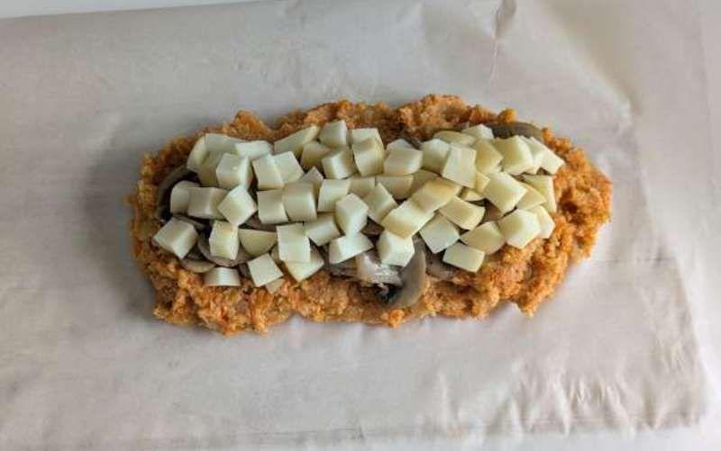 Mod de Preparare: Preîncălziți cuptorul la 200°C. Se taie dovleacul în cuburi și se așază pe o tavă cu hârtie de copt. Se condimentează cu ulei, sare, piper și rozmarin. Se coace timp de 25 de minute, amestecând la jumătatea timpului, până când se înmoaie și se caramelizează ușor. Se lasă să se răcească. Se curăță cartofii de coajă și se taie în cuburi. Se fierb timp de 15-20 de minute, se scurg și se pasează cât sunt încă fierbinți. Se lasă la răcit. Se curăță ciupercile și se taie în felii. Se încinge ulei cu un cățel de usturoi într-o tigaie, se adaugă ciupercile și se fierb timp de 10 minute, până când au eliberat și absorbit apa. Se scoate usturoiul, se condimentează cu sare și piper și se lasă la răcit. Se pasează dovleacul într-un castron mare. Se combină piureul de cartofi, oul, parmezanul, sarea, piperul și nucșoara. Se amestecă până la omogenizare. Se încorporează pesmetul puțin câte puțin și se amestecă bine. Se acoperă bolul cu folie și se dă la congelator timp de 10-15 minute. Se întinde aproximativ ¾ din aluat pe hârtie de copt, formând un dreptunghi cu o adâncitură în centru. Se umple cu ciuperci și brânză scamorza tăiată cubulețe. Se acoperă cu aluatul rămas și se compactează cu mâinile. Se rulează în hârtie de copt în formă de bomboană, închizând bine capetele. Se transferă într-o formă de chec, se desface hârtia, se taie excesul de hârtie de copt, se pudrează suprafața cu pesmet și se stropește cu puțin ulei. Coaceți la 180°C timp de 40 de minute. Se ridică temperatura la 200°C și se continuă timp de 5-7 minute pentru a rumeni suprafața. Checul de dovleac este gata!