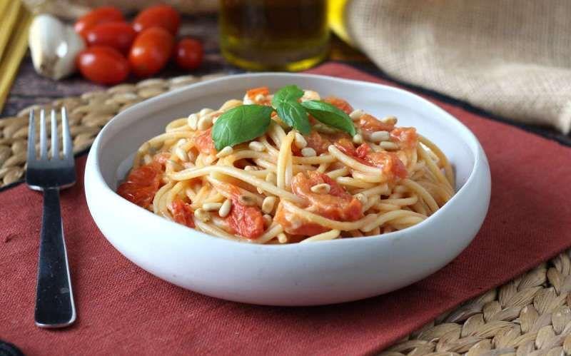 Mod de Preparare: Spălați bine roșiile cherry sub jet de apă, uscați-le și tăiați-le în jumătate. Păstrați-le deoparte. Turnați un strop generos de ulei de măsline extravirgin într-o tigaie mare, adăugați cățelul de usturoi și lăsați-l să se rumenească ușor. Se adaugă roșiile cherry, un vârf de cuțit de sare și câteva frunze de busuioc tocate cu mâinile. Se fierbe la foc mediu-mare timp de 9-10 minute, amestecând din când în când și zdrobind ușor roșiile cherry pentru a ajuta la scurgerea sucului. Se fierb spaghetele în multă apă sărată și se scurg foarte al dente direct în tigaia cu sosul de roșii cherry, după ce s-a îndepărtat usturoiul. Se adaugă o lingură de apă de gătit și se amestecă pentru a se amesteca, apoi se termină de gătit în tigaie. Se prăjesc nucile de pin într-o tigaie antiaderentă fierbinte, fără a adăuga grăsime, până se rumenesc ușor. Păstrați-le deoparte. Se oprește focul și se continuă cu amestecarea, adăugând parmezanul ras puțin câte puțin și amestecând energic cu cleștele până se obține o consistență cremoasă. Dacă este necesar, se mai adaugă puțină apă de gătit. Completați vasul cu nuci de pin prăjite și decorați cu câteva frunze proaspete de busuioc înainte de servire.