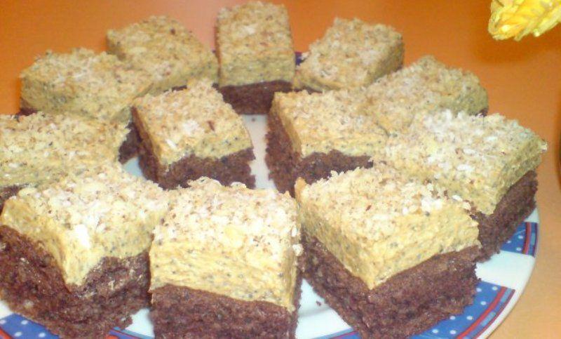 Crema: un pachet de margarina Rama il frecam spuma cu zaharul, apoi adaugatm galbenusul, 3 lingurite de ness si macul. Cand blatul este rece, intindem deasupra crema cu mac si dam la frigider. Se portioneaza. Presarati nuca de cocos sau puteti rade ciocolata.