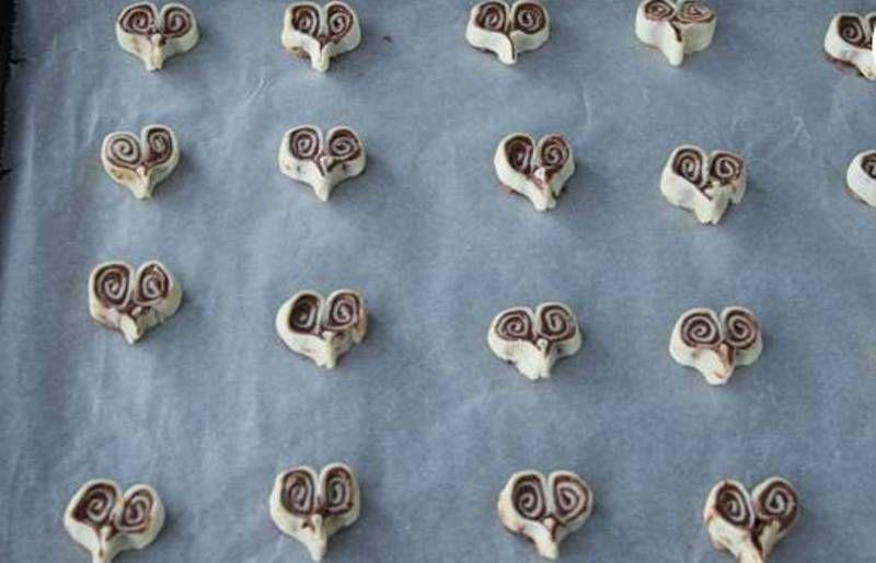 Mod de Preparare: Intindeti Nutella pe toata suprafata aluatului. Luati o parte a aluatului si rulati-o pana la centru. Faceti la fel si cu cealalta parte. Puneti aluatul la frigider timp de 30 de minute sau in congelator timp de 15 minute. Acest lucru va facilita taierea aluatului. Taiati discuri cu latimea de 1 cm. Apasati usor partea de jos a fiecarui disc pentru a da forma de inima. Puneti inimioarele pe o foaie de copt intr-o tava si coaceti timp de 10 minute la 180°C. Lasati sa se raceasca si serviti!