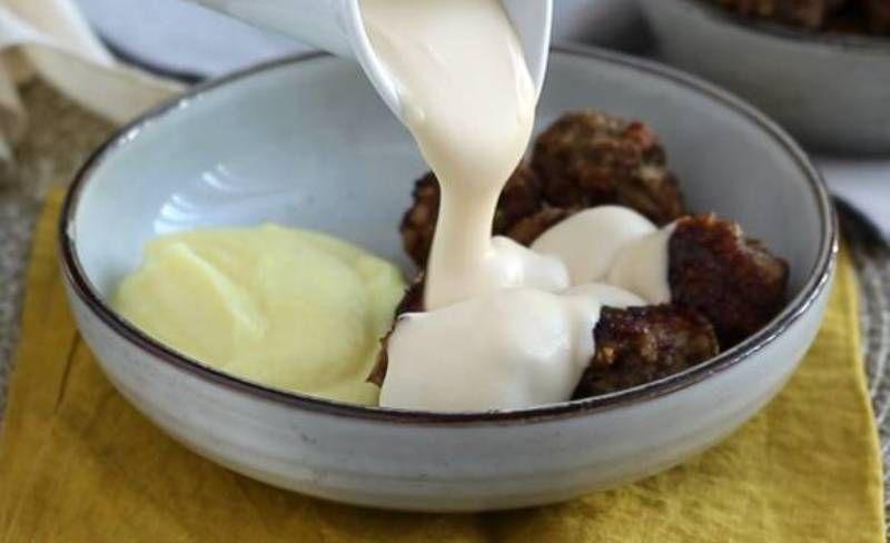 Sosul: Topiti untul intr-o tigaie. Adaugati faina si amestecati. Gatiti 2 minute. Adaugati supa si amestecați pentru a se ingrosa. Adaugati smantana, sosul de soia si mustarul. Gatiti inca 5 minute. Servim chiftelutele cu sos deasupra si piure de cartofi.
