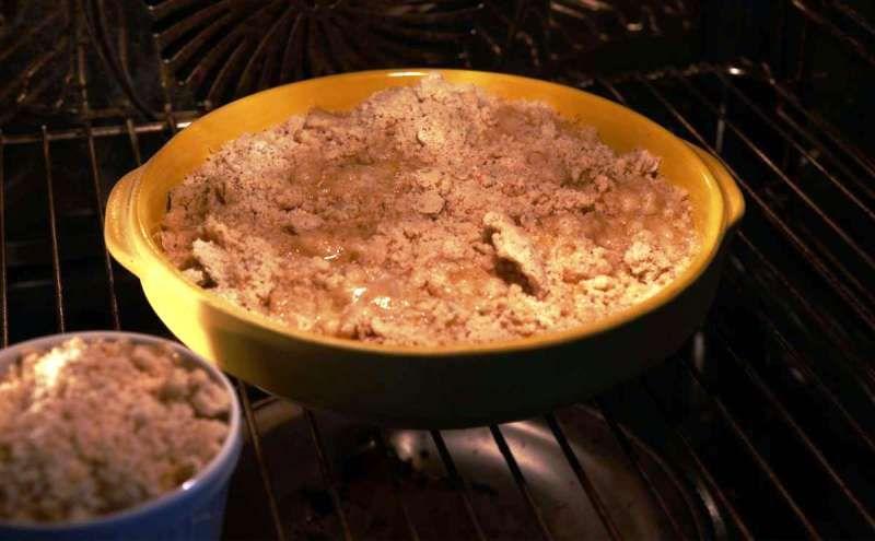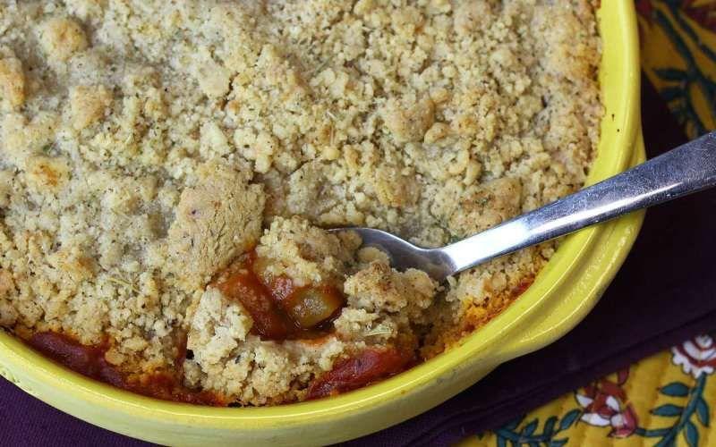 Mod de Preparare: Se amestecă făina, parmezanul, pudra de alune, rozmarinul și piperul. Se adaugă untul rece tăiat în bucăți mici și se frământă cu vârful degetelor pentru a forma crumble. Se toarnă legumele în vasul gratinat. Adăugați deasupra crumble-ul. Coaceți timp de 25 de minute la 180°C. Se ajustează timpul de gătire dacă este necesar. Dacă o preparați în ramekin-uri individuale mici: coaceți-le în cuptor timp de 15-20 de minute. Reglați timpul de gătire dacă este necesar!