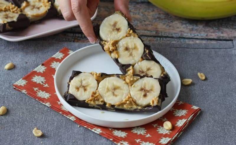 Mod de Preparare: Se taie banana în felii. Se pun felii de banană în fiecare adâncitură a formei pentru tablete, punem 3 felii în fiecare adâncitură. Adăugați o linguriță rasă de unt de arahide crocant în fiecare cavitate a formei. Puneți formele în congelator timp de 15 minute. Se topește ciocolata neagră și se acoperă fiecare cavitate a formei. Introduceți formele în congelator timp de cel puțin 15 minute. Întoarceți cu grijă și serviți. Dacă doriți, presărați cu alune fin tocate și savurați.