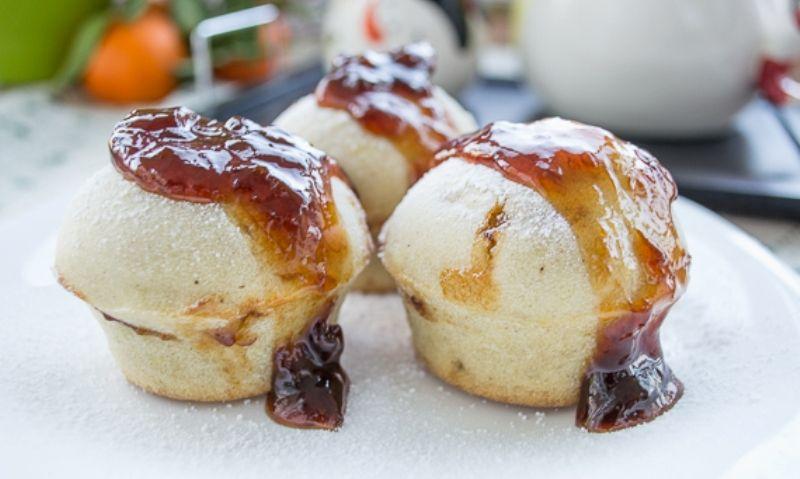 Mod de Preparare: Apa se pune pe foc intr-un vas mic, doar pana cand se incalzeste putin. Separat, se cerne faina intr-un vas, impreuna cu praful de copt. In acelasi vas se pun trei linguri de zahar, zaharul vanilat bourbon si coaja rasa de lamaie. Peste aceste ingrediente se toarna apa calduta si se amesteca cu o lingura. Se adauga cate o lingura de ulei si se amesteca, apoi cate o lingura de apa minerala. Compozitia se omogenizeaza bine cu o lingura de lemn. In formele de silicon se pune o lingura de compozitie, o lingurita de dulceata si iar o lingura de compozitie. Formele se baga in cuptor pentru 25-30 de minute. Dupa ce s-au copt, briosele se lasa la racit aproximativ 15 minute. Se pudreaza cu zahar si se adauga deasupra o lingurita de dulceata.