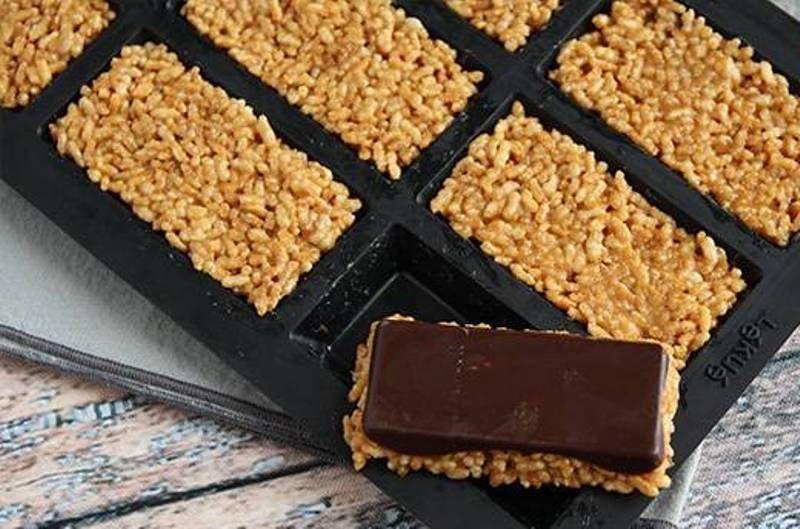 Mod de Preparare: În primul rand, vom pregati orezul expandat (in cazul in care ati cumparat orez expandat, mergeti direct la pasul următor) Avem nevoie doar de o tigaie antiaderenta. Puneti-o la foc mare si, imediat ce tigaia este complet fierbinte, adaugati o mana de orez (acoperind suprafata tigaiei). Trucul pentru ca orezul sa se umfle si sa nu arda este sa miscati tigaia fara sa o luati de pe foc, astfel incat sa nu piarda căldura. (Lasati cate 2 secunde fara sa miscati, apoi agitati fara sa ridicati de pe foc) Orezul, in cateva secunde, va incepe sa se umfle si sa sune ca si floricele, dar fara sa sara. Cand toate boabele sunt pufoase si usor prajite, turnati-le intr-un bol repede. Continuati sa faceti la fel cu restul de orez. Topiti ciocolata si acoperiti baza mini-matritelor (daca nu aveti, puteti folosi o tava dreptunghiulara si apoi la sfarsitul operatiunilor, taiati portiuni dreptunghiulare si veti avea batoane cu latimea dorita). Puneti la frigider 5 minute pentru ca ciocolata sa se intareasca. Intre timp, Intr-un bol punem untul de arahide + miere + vanilia si incalzim 40 de secunde in cuptorul cu microunde. Se toarna preparatul peste orezul pufos si se adauga sarea. Se amesteca bine. Scoateti matrita cu ciocolata intarita si turnati amestecul de orez in fiecare forma Apasati cu o lingura pentru a netezi suprafata. Puneti la frigider 1 ora. Scoateti din forma si savurati.