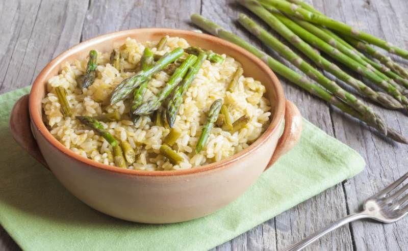 Mod de Preparare: Pregătiți sparanghelul: tăiați tulpinile și curățați tijele (cu excepția capetelor care vor fi gătite separat). Capetele de sparanghel dați-le deoparte și tăiați restul de sparanghel în bucăți. Într-o tigaie căliți ceapa tocată cu un strop de ulei de măsline timp de 2 - 3 minute. Adăugați orezul și amestecați până devine translucid. Deglasați adăugând vinul alb. Adăugați usturoiul, sarea, piperul, tulpinile de sparanghel tăiate bucăți (cu excepția capetelor) și amestecați Adăugați supa de legume puțin câte puțin în timp ce amestecați risotto-ul. După 15-20 de minute, gustați orezul. Acesta trebuie să fie moale dar ușor crocant în același timp. La sfârșitul gătitului, adăugați parmezanul și amestecați bine în risotto. Luați-l de pe foc și lăsați-l deoparte. Între timp, aduceți o oală cu apă la fiert și gătiți capetele de sparanghel timp de 2 minute. Scurgeți bine apoi rumeniți-le 2-3 minute într-o tigaie cu un strop de ulei de măsline.