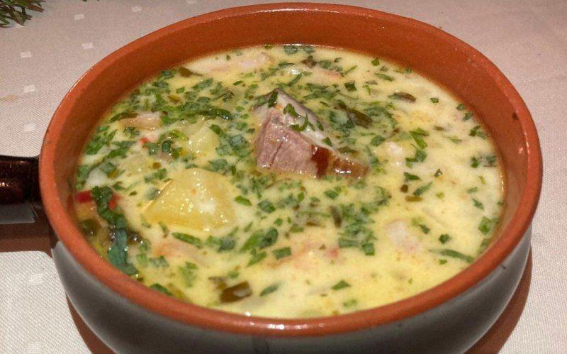 Mod de Preparare: Se fierbe carnea separat. Se caleste in putin ulei ceapa, se adauga morcovul taiat marunt si se stinge cu supa. Se pun cartofii, carnea afumata, sarea (daca mai e nevoie) si piperul. Dupa ce au fiert toate legumele se pun otet si tarhon dupa gust.