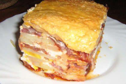 Mod de Preparare: Se fierb cartofii in coaja,se fierb si ouale,intr-o cratita se prajeste ceapa pana cand devine sticlos, se adauga carnatii taiati felii subtiri, se adauga putina apa si se lasa sa fiarba, se ia de pe foc. Cartofii se curata se taie rondele, la fel se procedeaza si cu ouale. Acum intr-un vas jena punem ulei si tapetam cu pesmet, punem un rand bun de cartofi saram, piperam, adaugam si putina vegeta, punem carnatii cu ceapa, ketchup, sos beschamel si smantana, continuam asa pana cand se sfarsesc ingredientele, presaram peste compozitie cas, dar e bun si fara, se da la cuptor incalzit circa 40 minute.