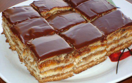 Mod de preparare: Intr-un vas se amesteca drojdia cu zahar pana se lichefiaza, se adauga untul moale, ouale intregi pe rand, amestecand pana totul devine ca o crema. Se adauga smantana, coaja de lamaie, vanilia, sarea si la final faina. Se amesteca fara sa se framante prea mult si se lasa la crescut cca 10-15 min. Aluatul se imparte in 4 parti egale. Se ia o bucata de aluat, i se da forma dreptunghiulara, se intinde cu merdeneaua, foaie groasa de 1/2 cm, dupa dimensiunea tavii de 20×30. Foaia se asaza neunsa intr-o tava tapetata cu hartie de copt, se unge cu marmelada, se presara cu nucile amestecate cu zahar, zahar vanilat. La fel se procedeaza si cu restul foilor, se suprapun, ultima foaie ramane neunsa. Tava se lasa la cald cca 30 min pentru dospirea foilor, apoi se coace la foc potrivit cca 1 ora. Dupa coacere se lasa la racit complet, apoi se glaseaza cu glazura de cacao. Dupa ce glazaura s-a intarit, prajitura se portioneaza in functie de preferinta.