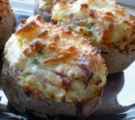 Mod de preparare: Cartofii se fierb in coaja, nu foarte mult ca sa nu se sfarame, se curata si se scobesc de miez cu o lingurita. Miezul scos, de la cartofi se pune intr-un bol si se amesteca cu branza rasa pe razatoarea mica, ouale, si pieptul de pui taiat fasii subtiri si prajite putin inainte dar si putin condimentate cu sare, piper si boia de ardei dulce.