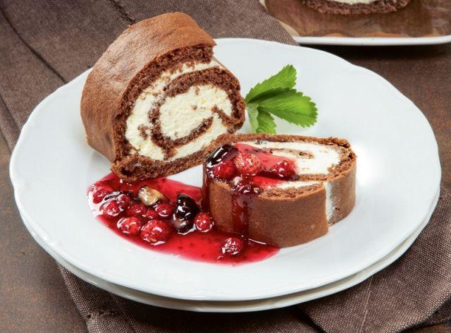 Preparare blat: Albusurile se bat spuma cu jumatate din cantitatea de zahar. Separat se bat galbenusurile cu jumatatea cantitatii de zahar si se amesteca cu siropul format din apa fierbinte cu cacao. Separat se amesteca faina cu amidonul si sarea. Apoi se amesteca usor toate ingredientele. Compozitia se intinde pe hartia de copt , in tava, si se pune la cuptor. Se incearca cu scobitoarea cand este gata si se scoate din cuptor. Blatul se intoarce cu fata pe un prosop umed, se dezlipeste hartia pergament de pe fundul lui, iar impreuna cu prosopul umed se ruleaza usor. Se lasa la racit, apoi se desface usor si se umple cu crema de fructe de padure.