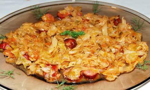 Mod de Preparare: Varza se curata de frunzele vestede si se taie fideluta, cu un cutit bine ascutit, in asa fel incat sa fie cat mai subtire. Se presara cu sare si se lasa circa o jumatate de ora, dupa care se freaca cu mana si se stoarce de zeama. Intre timp ceapa se taie solzisori si se pune in ulei la calit. Ardeiul se taie cubulete si se adauga peste ceapa atunci cand aceasta incepe sa prinda culoare. Rosiile se dau pe razatoarea mare pentru a scapa de pielita si a ramane cu un suc de rosii proaspat pe care il vom adauga in cratita peste ceapa si ardei amestecand sa nu se prinda.Stoarcem varza bine si o adaugam in cratita amestecand. Dupa cateva minute adaugam 2 cani de apa si lasam sa fiarba. Cand varza incepe sa se inmoaie adaugam feliutele de carnati si lingurile de bulion, amestecam si continuam fierberea. Dupa ce a fiert varza si apa a scazut adaugam verdeturile tocate, sare si piper dupa gust. Mai lasam cateva minute focul pornit apoi il oprim si acoperim cu un capac.