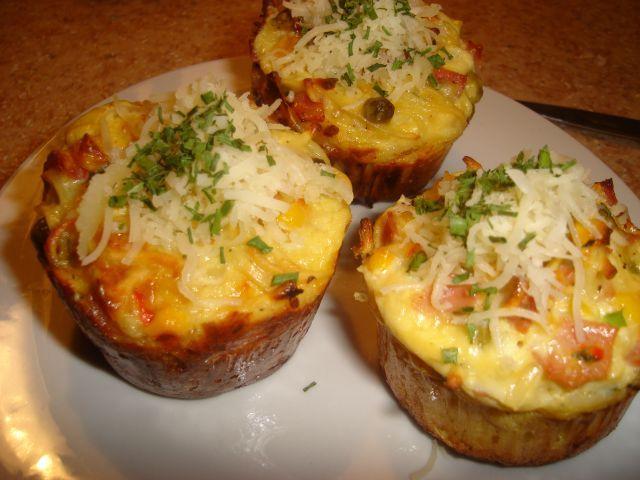 Ceapa se taie rondele, sunca si cascavalul se taie cubulete si se adauga toate peste amestecul de faina. Batem oul, turnam cana de lapte si untul topit, dupa ce s-a racorit putin. Omogenizam ingredientele uscate cu amestecul de ou, lapte si unt. Umplem formele de muffins si le coacem la 200 de grade pentru aproximativ 25 minute.