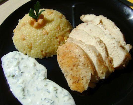 Intr-o tigaie incingem ulei de masline si frigem pieptul de pui cateva minute la foc mic, pe toate partile. Pastele marunte (cus-cus) se prepara conform instructiunilor de pe plic dar cu supa de pui. Pregatim fiecare farfurie pentru servit cu piept de pui feliat, sos racoritor si garnitura de cus-cus.