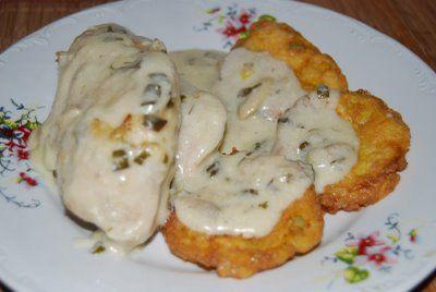 Se face sosul. Se topesc 2 linguri de unt intr-o tigaie, se adauga ciupercile curatate si taiate feliute. Se calesc pana se inmoaie. Se presara faina si se toarna laptele si putina apa, amestecand continuu cu un tel, pana se leaga sosul. Se adauga smantana. Se potriveste de sare si piper. Se serveste pieptul de pui cu sosul fierbinte.