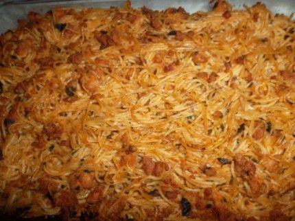 Separat fierbem pastele in apa cu sare, dupa care le punem la scurs. Intr-un vas mai mare amestecam pastele impreuna cu carnea, sosul de rosii, patrunjelul si cascavalul ras si le dam la cuptor 10 minute. Se servesc calde si, dupa preferinte, cu smantana.