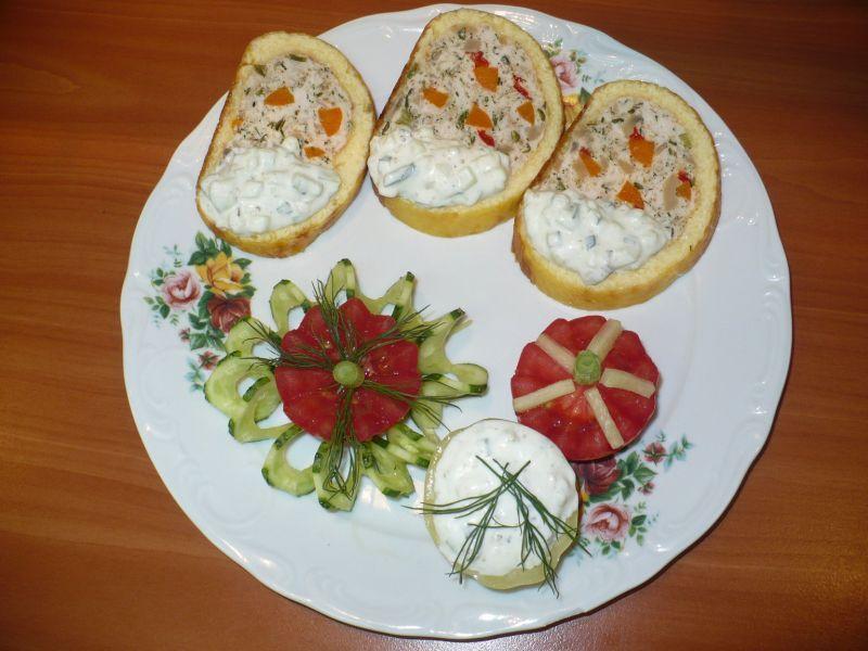Se fierbe pieptul de pui in apa cu sare apoi se da prin masina de tocat. Mixam untul pana devine cremos. Adaugam mustarul, crema de branza si patrunjelul si incorporam. Adaugam pieptul de pui si ardeiul taiat cubulete. Asezonam cu sare si amestecam bine pana se omogenizeaza. Punem compozitia pe o folie si rulam strans in forma de rulada. Dam la frigider pentru cel putin o ora. Scoatem apoi rulada din folie si o feliem.