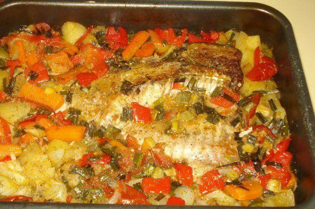 Mod de preparare: Prima dată, pregătim peștele. Bucățile de pește se pun într-un castron. Peste ele turnăm câțiva stropi de ulei de măsline, zeama de la o lămâie și verdețuri. Le amestecăm (cu mâna) bine, până ce fiecare felie de pește e atinsă de ulei și de verdețuri. Apoi lăsăm peștele deoparte, acoperit, să se îmbibe de arome. Apoi tăiem legumele. Carfofii se taie în sferturi, morcovii se taie rondele, ceapa se taie peștișori (nu foarte mici), cățeii de usturoi se taie felii, lămâia se taie în felii rotunde care apoi se taie pe jumătate, iar broccoli se lasă întreg. Dacă nu vă place mai acru, puteți să nu puneți toate feliile de lămâie, sau chiar să nu puneți deloc. Însă zeama din lămâie dă un gust special, răcoritor, mediteranean celorlalte legume. Se așează în tavă, se toarnă câțiva stropi de ulei de măsline, se pun verdețurile, se toarnă apă până se acoperă și se dau la cuptorul încins în prealabil. (puteți aprinde cuptorul când vă apucați de tăiat legumele, de exemplu)