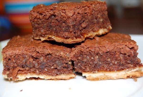 Mod de Preparare: Blatul se face ca unul clasic de tarta: unul rece se incorporeaza in faina formandu-se frimituri. Apoi se adauga zaharul, smantana si galbenusurile. Aluatul rezultat se intinde pe o suprafata presarata cu faina, de forma tavii. Eu am pus intr-o tava mare. Se baga la cuptorul preincalzit la foc potrivit pentru 10 minute. Se scoate si se lasa sa se raceasca. Intre timp se prepara umplutura: Se bat albusurile spuma, apoi se adauga zaharul, faina, cacao, coaja de lamaie si nucile macinate putin cate putin cu ajutorul unei linguri. Blatul racit se unge cu gemul si apoi se toarna bezeaua cu nuci. Se baga in cuptorul preincalzit pana cand este gata. Se lasa sa se raceasca si se taie.