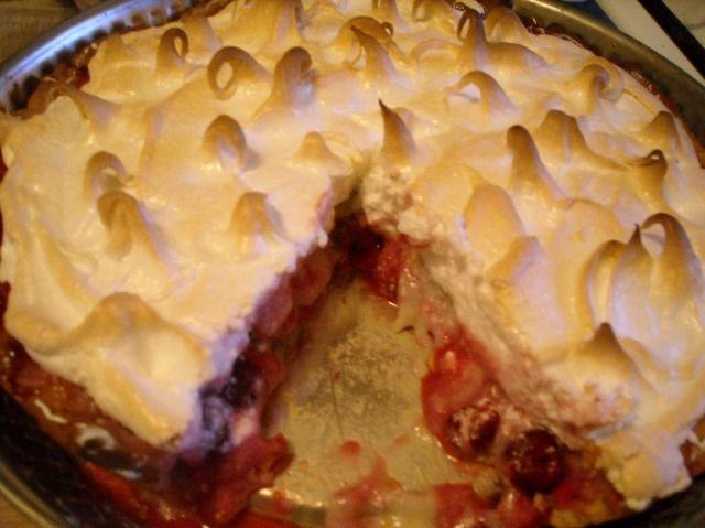 Crema. Am frecat galbenusurile cu zahar pana s-au facut spuma, am adaugat zeama si coaja de lamaie si laptele. Le-am fiert cam 5 minute la bain marie, cu atentie sa nu se taie crema. Dupa ce a inceput sa se ingroasa, am dat-o de pe foc si am amestecat untul. Se pun visinele (eu am avut congelate, deci trebuie lasate sa se dezghete si sa se scurga de zeama, in prealabil) si peste ele se adauga crema. Albusurile ramase (de la cele trei oua) se bat bat cu sapte linguri rase de zahar. Se aseaza bezeaua peste tarta si se da la cuptor pentru 10 minute.