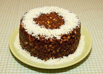 Mod de preparare: Biscuitii se rup bucati (nu foarte mici). Pelteaua (sau zeama de dulceata) se amesteca cu laptele caldut, turnand cate putin lapte peste peltea si amestecand circular (compozitia se poate taia). Compozitia se toarna treptat peste biscuiti si se amesteca. Peste acestea se pun alunele maruntite si ciocolata. Toata compozitia se amesteca foarte bine si se pune in forma dorita dupa care se orneaza cu ciocolata alba razuita. Tortul se tine la frigider pentru 5-6 ore, de preferat se lasa peste noapte.