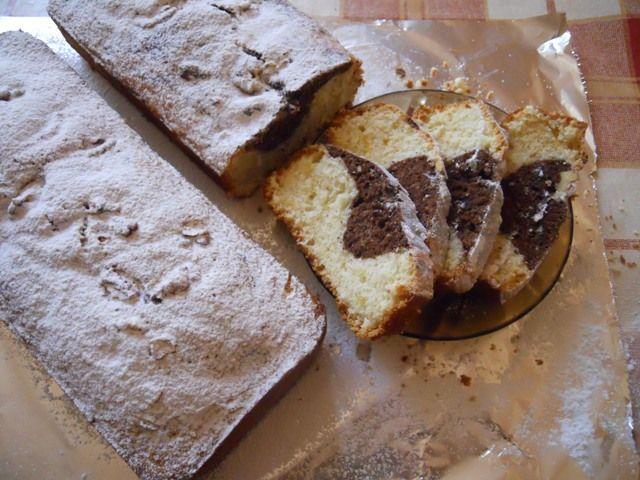 Mod de preparare: Mixati ouale cu zaharul si zaharul vanilat pana ce compozitia devine ca o crema. Adaugati uleiul, sarea, zeama si coaja rasa de portocala (sau lamaie), esente dupa gust (vanilie, rom, etc) si la final faina amestecata cu praful de copt. Daca alegeti sa-l faceti si cu cacao, amestecati cacao cu 15 linguri din compozitia simpla (opriti din compozitie inainte de a pune toata faina). Intr-o tava tapetata cu ulei si hartie de copt turnati mai intai compozitia simpla, apoi pe cea cu cacao. Deasupra presarati nuci faramitate, fulgi de migdale stafide sau ce va place. Dati la cuptorul preincalzit la 180 grade timp de 10 minute, dupa care reduceti focul la 170 grade (foc potrivit) si mai lasati 45 minute. Dupa ce-l scoateti din cuptor asezati-l pe o parte la racit.