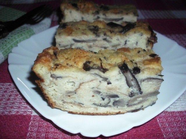 Mod de preparare: Spalam ciupercile bine si le taiem in bucati mai mari. Punem uleiul intr-o tigaie mai mare, adaugam ciupercile si usturoiul pisat si lasam la foc mediu pana se inmoaie. Dam deoparte si condimentam cu sare si piper dupa gust. Batem ouale cu telul, adaugam apoi smantana, laptele, cascavalul ras, sare si piper. Taiem painea felii, apoi cubulete mai mari. Adaugam cubuletele de paine peste amestecul de lapte, punem apoi ciupercile si mai adaugam sare daca este nevoie. Amestecam usor. Lasam amestecul circa 10 minute, ca painea sa traga tot lichidul. Ungem si tapetam un vas termorezistent. Adaugam compozitia si o introducem in cuptorul incalzit in prealabil. Lasam budinca la cuptor la foc mic pana se rumeneste frumos deasupra. Servim budinca calda. Este la fel de gustoasa si rece.