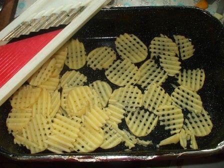 Se scot şi se pune pe fiecare felie de cartof câte o bucaţică de caşcaval şi se mai lasă la cuptor cam 10 min. (Dacă nu sunteţi siguri că s-au copt puteţi să-i gustaţi înainte de a-i scoate.) Aceşti cartofi pot fi folosiţi cu succes pe post de garnitură la diferite mâncăruri.