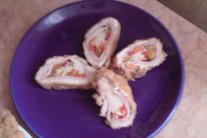 Mod de Preparare: Se bate pieptul de pui,se condimenteaza cu sare si piper, se unge cu un strat subtire de mustar peste care se pune parizerul feliat subtire, apoi se pun castravetii si gogosarii taiati cubulute, la fel si cateva cubulute de cascaval; se ruleaza si se prinde la capete cu scobitori dupa care se dau prin faina, ou si pesmet dupa care se prajesc in ulei incins.