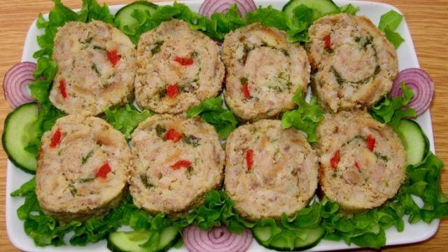 Mod de preparare: Intr-un bol punem carnea tocata, franzela inmuiata in apa rece si stoarsa, ceapa rasa si stoarsa, ouale, piper si sare dupa gust. Amestecam compozitia cu o lingura de lemn pana obtinem o compozitie omogena. Compozitia obtinuta se intinde pe o folie de aluminiu, in forma de dreptunghi. Se adauga ardei gogosar tocat, patrunjel proaspat tocat si cascaval ras. Cantitatea de ardei, patrunjel si cascaval se adauga in functie de preferinta. Se ruleaza cu ajutorul foliei, se inchide folia bine la capete si se pune intr-o tava la cuptor, pentru 1 ora, la foc potrivit. Rulada ramane in folia de aluminiu. Dupa 1 ora se scoate din cuptor, se lasa sa se racesca cca 10 min, apoi se indeparteaza cu grija folia. Pe o folie de aluminiu se presara pesmetul, se pune rulada si se ruleaza din nou, astfel incat sa aiba pesmet pe toata suprafata. Se lasa sa se racesca complet, apoi se introduce la rece pentru cca 3 ore. La servire, se indeparteaza folia, se taie in felii potrivite si se pune pe platou decorat cu salata verde.