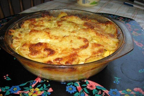 Mod de preparare: Se spală cartofii şi se pun să fiarbă în apă cu sare, acoperiţi cu un capac. După ce au fiert, se scot din apă şi se lasă să se răcească. Se curăţă de coajă şi se împart în felul următor: jumătate se taie rondele şi cealaltă jumătate se pasează cu blenderul sau cu telul special pentru cartofi. Se rade brânza de oaie pe răzătoarea mică şi se amestecă cu 3 ouă crude. Se unge tava cu unt, pe toată suprafaţa şi se pune primul strat de rondele. Peste primul strat se adaugă piureul de cartofi şi brânza amestecată cu ouăle. Se adaugă cele trei ouă fierte. Se acoperă cu un alt strat de rondele, cu caşcaval ras şi cu smântână şi se bagă în cuptor.