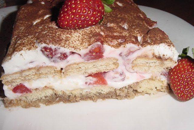 Asamblare tort: Cel mai bine ar fi sa aveti o forma patrata de tort cu inel detasabil (35cm/ 35cm) pentru asamblarea acestui tort, sau o tava. In felul acesta crema nu se va scurge pe margini si va avea timp sa se intareasca frumos. Punem cafeaua intr-un castronel si inmuiem fiecare piscot pentru o secunda in cafea. Asezam un rand de piscoturi, apoi punem o treime din crema, iar piscoturi si la final crema. Putem sa facem tortul cu 2 straturi de crema sau cu 3, in functie de marimea formei (sau a tavii). Ultimul strat trebuie sa fie de crema. Primul strat de piscoturi il asezam intr-un sens, al doilea strat il asezam invers (perpendicular). Am ornat cu capsuni trase in ciocolata si pentru dungulitele de deasupra am facut o crema ganache din 100 ml ciocolata amaruie si 100 ml frisca lichida. Ganachul se face foarte usor, incalzind frisca lichida apoi adaugam ciocolata rupta bucatele si omogenizam pana devine o crema lucioasa. Se lasa la racit pana cand are o consistenta buna pentru ornat. Se lasa la rece cel putin 4 ore ca sa se inchege bine crema. Este delicios de racoritor!