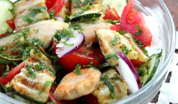 Mod de preparare: Dovlecelul se spala si se taie fasii. Pieptul de pui se taie cuburi, se condimenteaza cu sare si piper, apoi se prajeste bine pe ambele parti in ulei incins. Cand este gata, se scoate intr-un bol pe servetel absorbant. In uleiul ramas de la pui se prajesc fasiile de dovlecel, pe ambele parti. Intr-un bol mai mare se adauga rosiile taiate felii, castravetii taiati rondele, ceapa rosie taiata rondele, patrunjelul taiat marunt, pieptul de pui si dovlecelul taiat fasii. Se amesteca usor, astfel incat vom obtine un colorit variat. Peste salata se adauga ulei, sare si piper dupa gust. Dupa preferinta se poate servi cu zeama de lamaie.