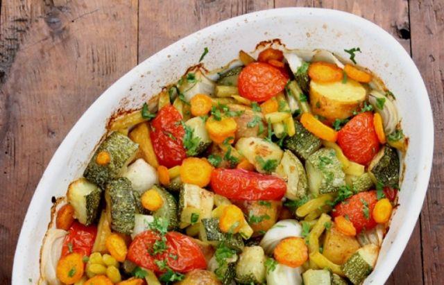 Mod de preparare: Legumele se curata si se spala. Fasolea se rupe in bucati potrivite si se fierbe 3 min in apa cu sare. Dovleceii se taie cubulete si ii prajim cateva minute in ulei incins. Cartofii se taie pe jumatate si, impreuna cu morcovii taiati rondele, se calesc in uleiul in care am calit dovleceii. Ceapa se taie in 4. Intr-un vas termorezistent se pun legumele – cartofii, morcovii, fasolea, dovleceii, ceapa si rosiile taiate fasii, astfel incat sa obtinem un colorit variat. Se adauga sare si piper dupa gust, apa calda si uleiul in care am prajit legumele. Se introduce vasul la cuptor pentru 30 min, la 160C. Legumele se servesc calde, cu patrunjel proaspat tocat marunt.