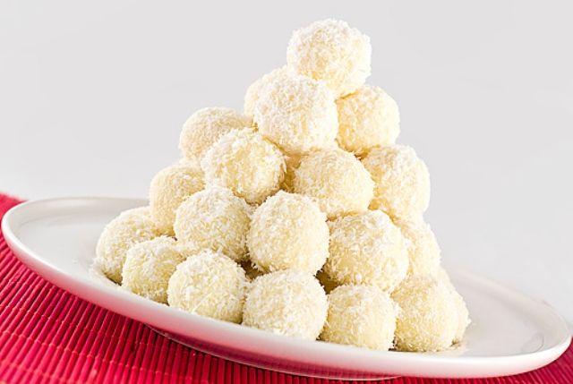Mod de Preparare: Amestecam nuca de cocos cu laptele condensant si lasam 15 minute pentru ca nuca sa absoarba laptele. Verificam consistenta amestecului si daca mai este nevoie adaugam nuca de cocos. Formam apoi bile si punem o migdala in mijlocul fiecareia. Tavalim bilutele prin nuca de cocos si le asezam pe un platou. Pentru o aroma mai intensa se lasa la frigider peste noapte.