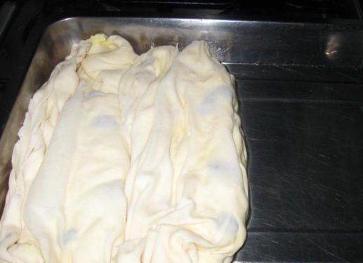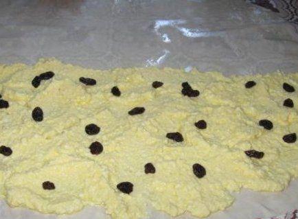 Foile se intind pe rand, se ung cu ulei, se aseaza compozitie doar pe jumatate de foaie si se presara stafide dupa gust. Se aduce cealalta jumatate de foaie deasupra compozitiei, se aduna prin incretire si se aseaza in tava unsa foarte bine cu ulei. Inainte de a introduce tava in cuptorul preincalzit in prealabil cu cca 15 minute, turnam deasupra amestecul format din 2 oua, o lingura de ulei si 12 linguri de iaurt.