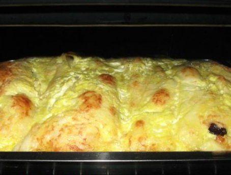 Inainte de a fi introdusa la cuptor se toarna deasupra un amestec format din 2 oua, 12 linguri iaurt,o lingura ulei