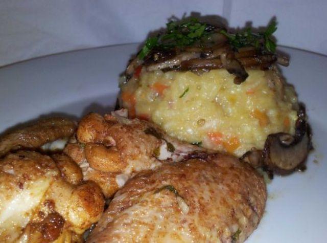 Mod de Preparare: Taiati ardeiul, morcovul si ceapa in cuburi mici si caliti in putin ulei. Adaugati ceasca de orez doua cesti de apa calduta si un praf de sare si piper apoi lasati sa fiarba pe foc mic amestecand din cand in cand sa nu se prinda. Daca mai este nevoie mai adaugati putina apa. In timp ce orezul se fierbe, spalati aripioarele si imbracati-le in lingurita de paprika cu un praf de sare si piper apoi prajiti-le cate doua minute pe fiecare parte sa sigilati sucurile naturale ale puiului. Puneti-le intr-un vas termo rezistent (eu am pus si cateva felii de ciuperci si ardei gras pentru un plus de gust) si dati la cuptor 180C/gaz 4 pentru 25 de minute. Taiati ciupercile in felii subtiri si prajiti-le cu usturoiul pisat in putin ulei pana ce scade apa. Adaugati un praf de sare si piper. Cand orezul s-a fiert stingeti focul si potriviti de sare si piper. Scoateti aripioerele din cuptor, asezati totul pe farfurie si repede la masa sa nu se raceasca.