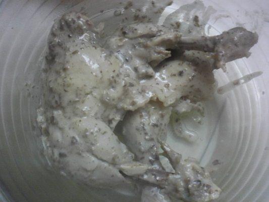 Pregatesc sosul: faina amestecata cu smantana, sare, piper, marar. Adaug sosul in vasul cu ciuperci, condimentez, las 5 minute sa clocoteasca, adaug pulpele pentru inca 5 minute, presar cu patrunjel verde. Servim cu mamaliguta sau cu piure de cartofi.